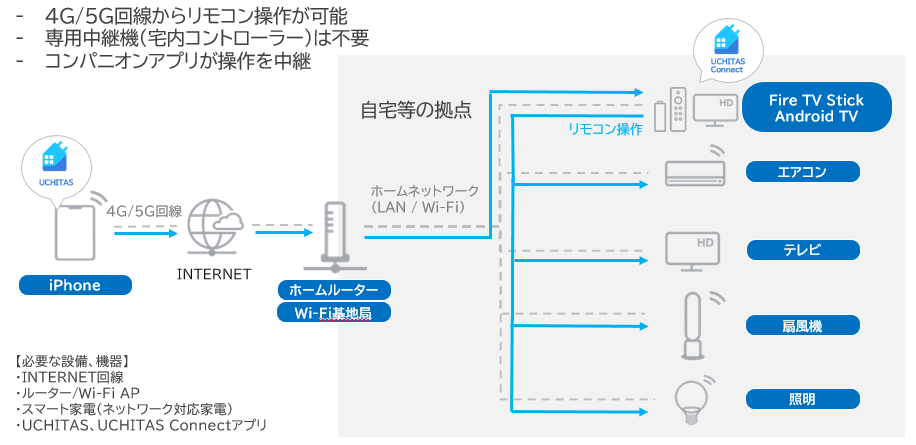 UCHITASが動作するiPhone、UCHITAS Connectが動作するAmazon Fire TV StickまたはGoogle TVが必要です。また、UCHITAS